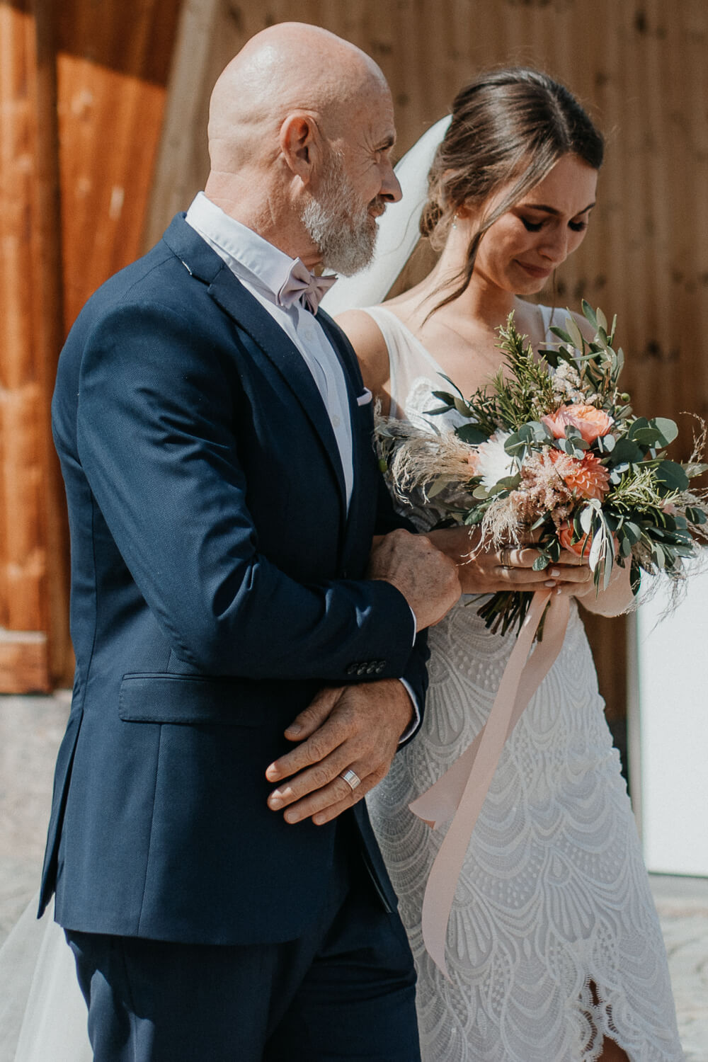 Sarahs Freundinnen haben für die Hochzeit wirklich an alles gedacht: Von den Einladungen, bis hin zur Deko und dem Strumpfband. Beim Getting Ready entstanden deshalb wunderschöne Momente, die die drei nicht so schnell vergessen werden. Auch Sarahs Mama durfte bei den Vorbereitungen nicht fehlen. Der „First Look“ mit Sarahs Vater war sehr emotional und er platzte förmlich vor stolz.